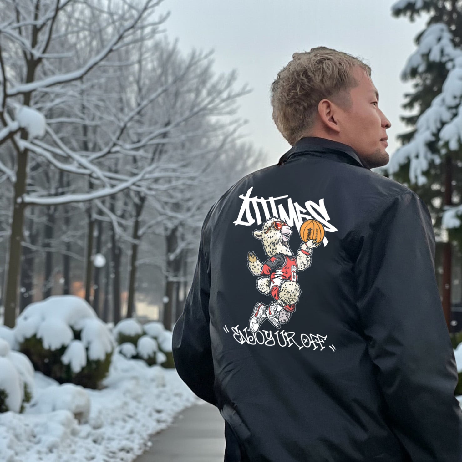 アルパカポール冬毛バージョンのアイテムが登場。谷口大智選手が普段よく愛用しているコーチジャケット、今期はアニマルバスケをプリント。様々なシーンでラフに着こなしてください。